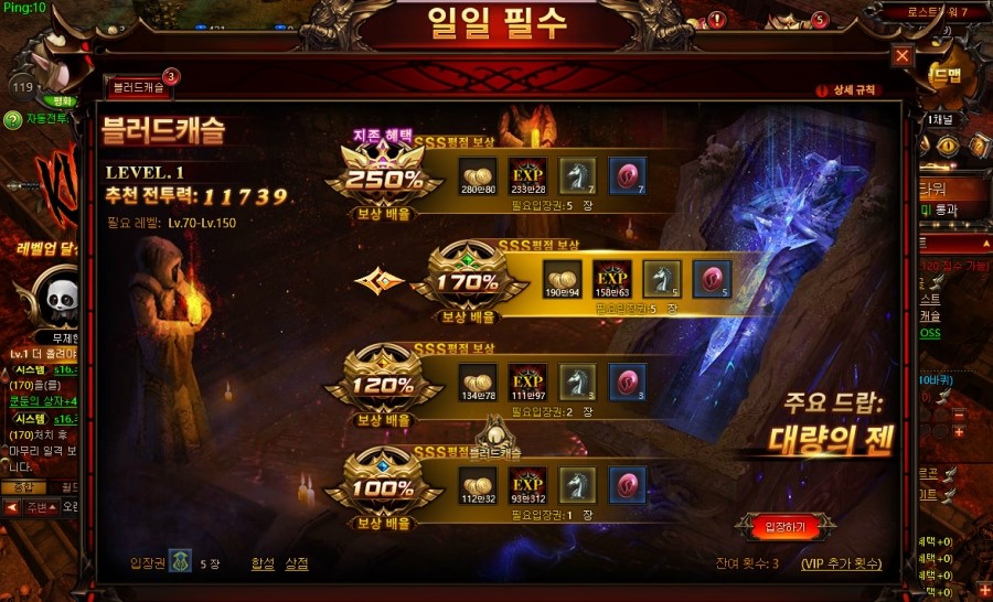 두번째는 블러드캐슬. 사실 블러드캐슬은 금화를 얻는데 더 특화가 되어 있습니다. 그래서인지 추천 전투력도 악마의 광장도 낮은데요.