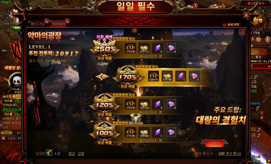 경험치를 빠르게 획득해서 환생을 해야합니다. 레벨업의 끝에서는 다시 환생을 통해 더욱 강력한 캐릭터가 되기 때문인데요. 매일 입장하는 횟수가 충족되면