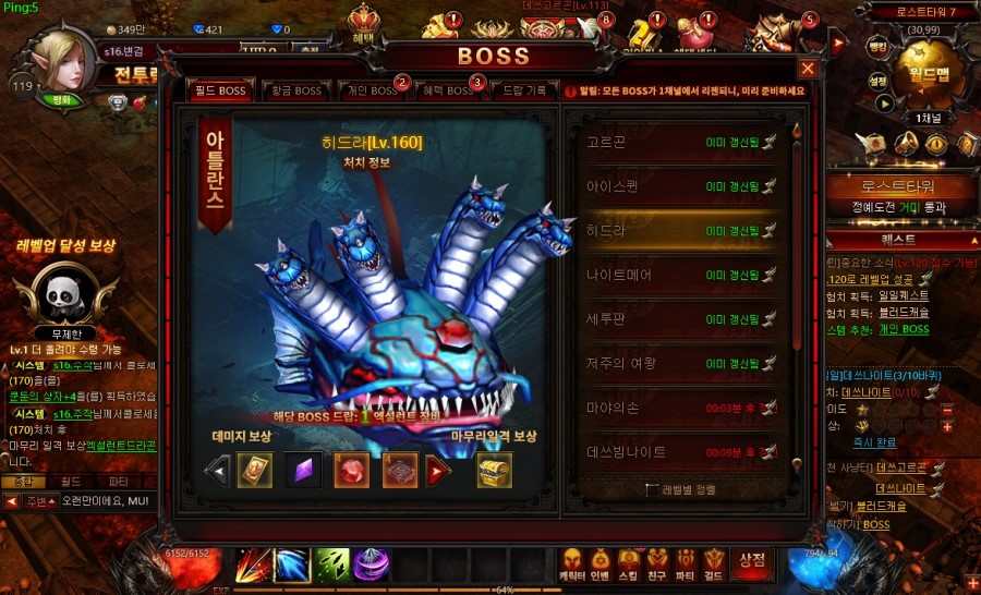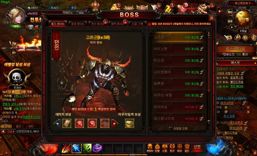 보스던전도 잘 준비가 되어 있는데요. 보스종류가 엄청납니다. 레벨마다 추천보스를 알아서 척척 알려주기 때문에 힘들게 찾아갈필요 없이 원클릭한방이면