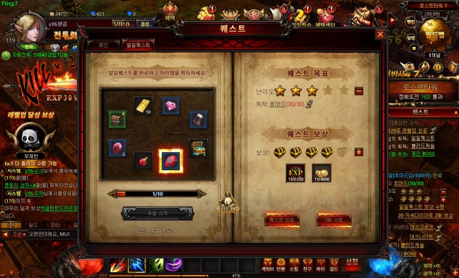 세번째는 일일퀘스트. 매일 할 수 있는 일일퀘스트가 10번인데요. 이 경험치가 또 쏠쏠합니다. 10번 완료하면 룰렛으로 추가 아이템을 받을 수 있어서