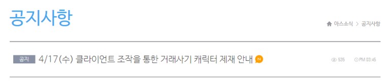 클라이언트 조작을 통한 거래사기 캐릭터 제재가 이루어 젔습니다.