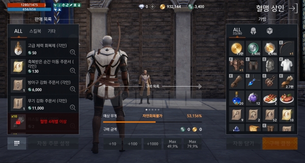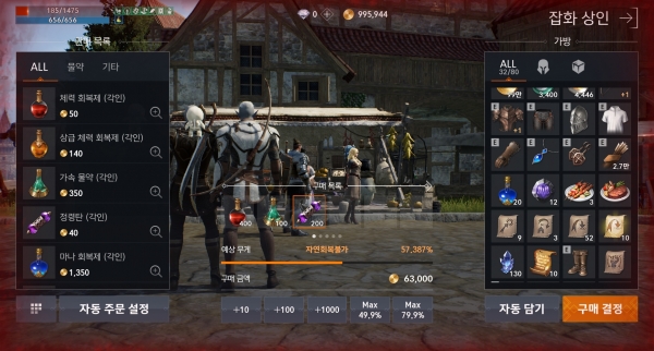 다음으로 갈 곳은 잡화상이다. 잡화상에서는 너무 아이템을 너무 많이 사면 안 된다. 체력회복제 300~400개, 가속 물약, 정령탄 등 자신이 필요한 물건을 사면 되는데, 50%를 넘으면 자동 회복이 되지 않기 때문에 위험할 수 있다. 대개 자동 사냥 돌려놓고 돌아오면 어느새 화면이 벌겋게 물들어 있다. 잡화상은 앞으로 자주 오게 될 곳이니 자동 주문 설정을 해두면 편리하다. 잡화상 대화창에서 '자동주문 설정'을 누르고, 각각 필요한 만큼 개수를 정한 다음 '설정 완료'를 누FMS다. 그러면 다음부터는 그 수량만큼만 자동으로 한방에 구매할 수 있다.