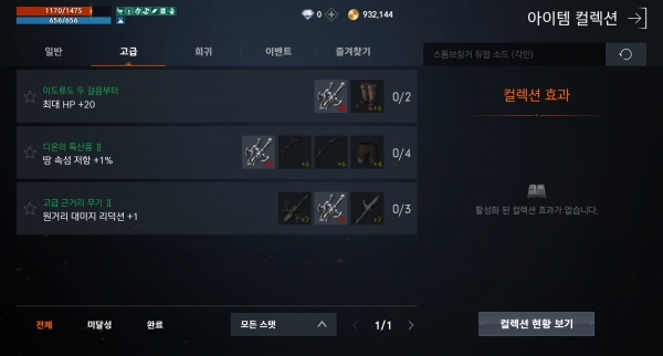 장비를 아무 생각 없이 팔거나 분해하면 안 된다. 메뉴에 컬렉션이라는 시스템이 있는데, 화면에 표시된 아이템을 모으면 컬렉션 효과가 활성화된다. 해당 아이템이 있어야만 활성화되는 시스템이라 팔거나 분해하면 효과를 보기 힘들다.