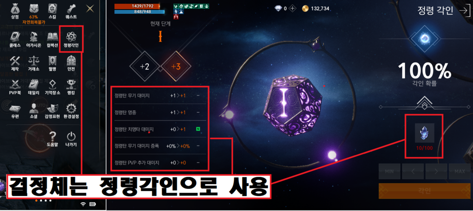 장비아이템은 도감작으로 스탯을 상승시키거나 또는 분해를 통해 결정체를 얻어 정령각인을 할 수 있습니다.