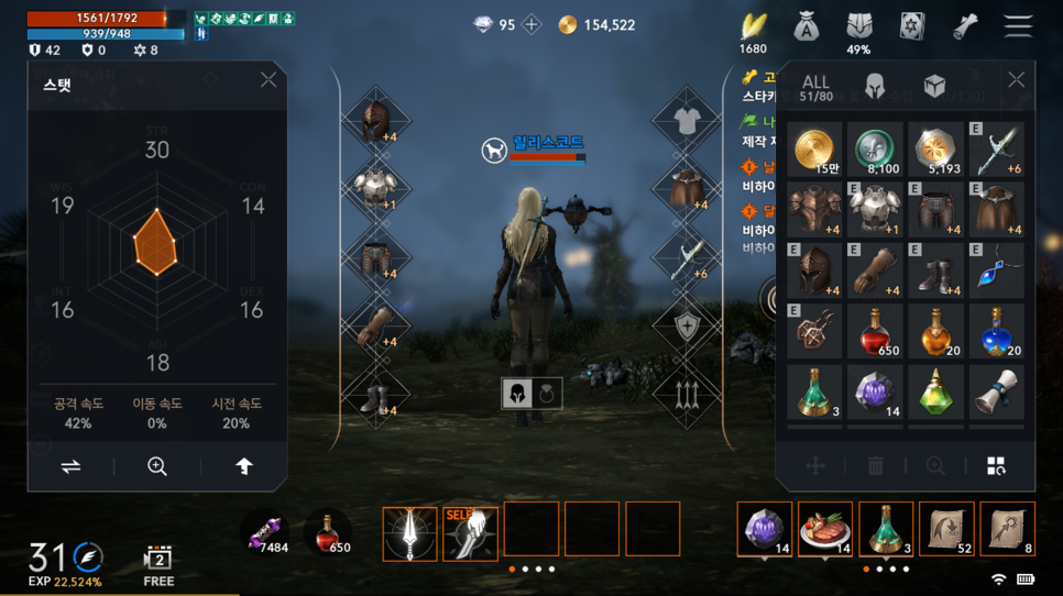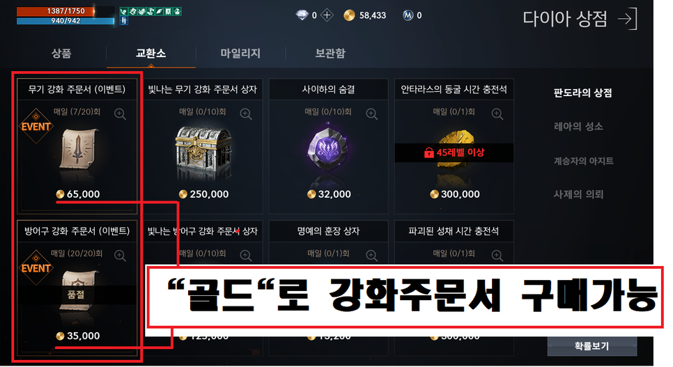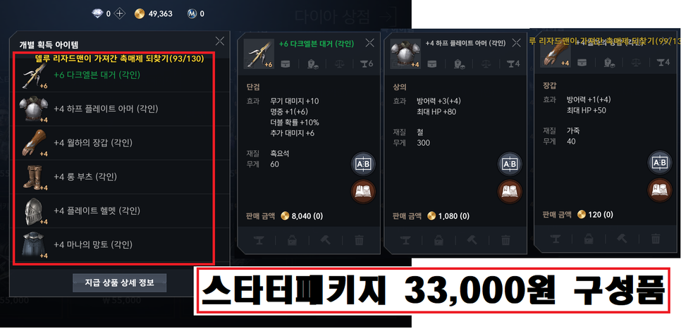 초반에 메인퀘스트로 획득하는 골드를 모아서 강화주문서를 구매해 장비를 강화한다면 굳이 스타터패키지없이도 게임진행을 원할하게 할 수 있습니다.