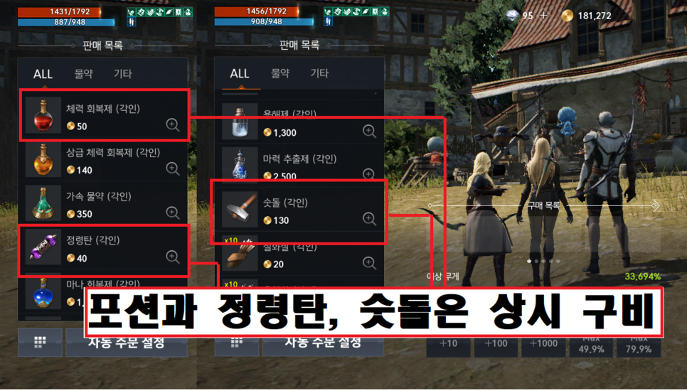 1. 초반 메인퀘스트로 받는 골드는 강화주문서를 구매합니다.