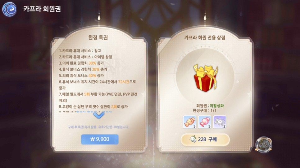 저렙구간을 빠르게 탈출하여 다른 유저들과 재미를 보고 싶은 분들은 아마 과금을 생각하고 있을 거에요. 사실 성장을 원한다면 반드시 필요한 수단이기도 하죠. 다만 과금도 효율적으로 해야 합니다. 똑 같은 금액을 써도 다른 결과를 보일 수 있기 때문인데요. 가장 기본적으로는 9,900원에 구매할 수 있는 카프라 회원권을 추천 들비니다. 전용 상점을 사용할 수 있을 뿐만 아니라 추가 경험치, 휴식보너스, 창고 및 아이템 휴대 등 다양한 혜택을 누릴 수 있습니다.