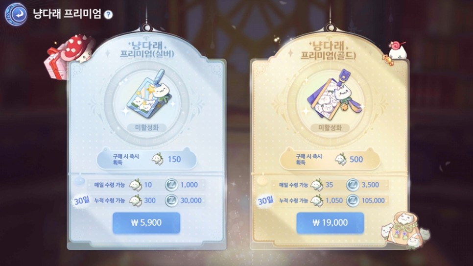 적어도 한 달의 기간 동안 플레이 할 의향이 있는 분들은 냥다래 프리미엄을 구매하면 되겠습니다. 실버와 골드로 나뉘어져 있으며 둘 다 구매할 수 있습니다. 여기까지만 하면 2만4천9백원을 소모하게 되며 이전에 설명 드린 카프라 회원권까지 하면 34,800원이네요.