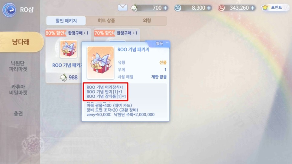 프리미엄을 통해 얻은 냥다래는 다양한 패키지 및 외형 등 아이템을 살 때 사용할 수 있습니다. 레벨이 높아지면 더 많은 상품들이 들어오게 되는데요. 특히 ROO 기념 패키지는 꼭 구매하는 것을 추천 드립니다. 일반 필드에서 구할 수 있는 아이템들과는 비교과 되지 않는 상당히 좋은 장신구들을 획득할 수 있습니다. 보스를 공략하기에도 굉장히 쉬워질 거에요.