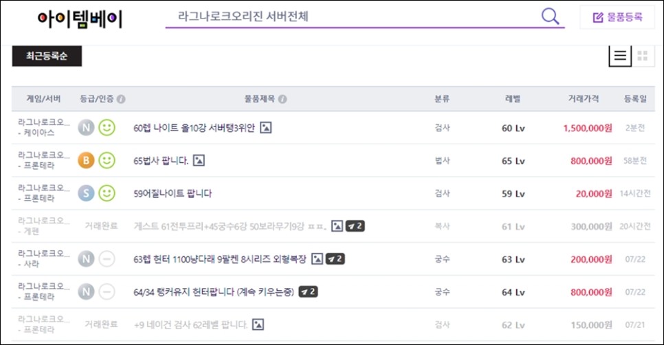과금으로는 한 순간에 고 레벨이 될 수 없습니다. 꽤나 많은 시간을 소요하게 되는데요. 이러한 과정들이 귀찮다고 느껴진다면 아이템베이 같은 중계사이트에서 거래를 하는 것도 괜찮은 방법입니다. 이미 누군가가 완성해놓은 결과물을 쉽게 구할 수 있기 때문인데요. 적게는 만원대부터 많게는 백만원대까지 다양한 가격대의 물품이 대기하고 있습니다.