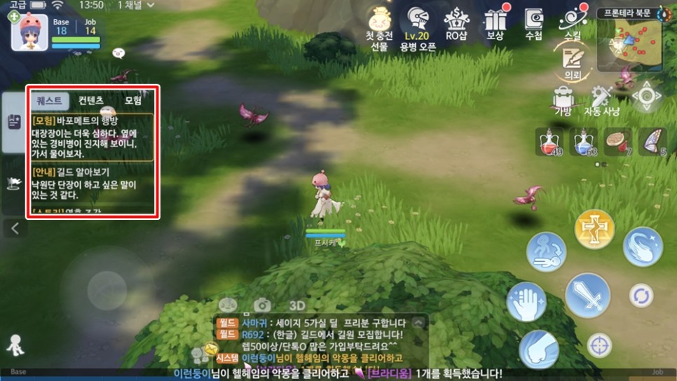 튜토리얼을 마치고 전직을 진행하고 나면 더 이상 가이드가 진행되지 않기 때문에 무엇을 먼저 해야할지 갈피를 잡기가 힘들 수 있는데요. 30레벨 이전까지는 모험 퀘스트를 하는 게 가장 빠른 성장의 지름길 입니다. 사실 이 레벨 구간에서는 딱히 할 수 있는 콘텐츠도 없기 때문에 공략이라고 말하기엔 애매하긴 해요.
