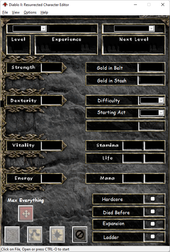 이 응용 프로그램은 캐릭터의 특정 능력치를 간단하게 조정하는 것을 목표로 합니다. 이 편집기는 디아블로 II 레저렉션 v1.2.68992(공개 테스트 서버 2.4) 및 디아블로 II 클래식 v1.14b와 파괴의 군주 확장팩으로 테스트되었습니다. 인터페이스는 장르 기반이므로 게임과 일치하는 모양과 느낌을 갖게 됩니다.