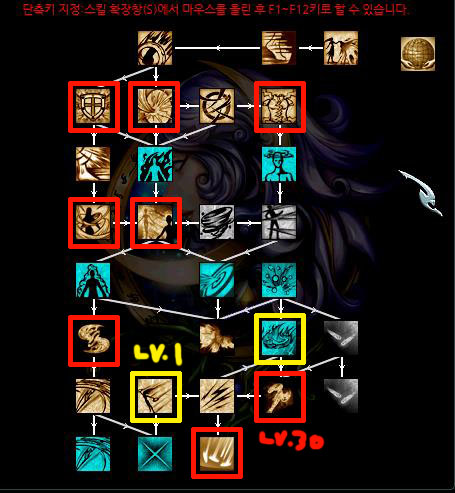 다크에덴 전아 스킬 트리 입니다. 빨간색은 마스터 스킬레벨 30 추천이구요.