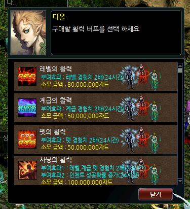 활력 버프 구매라는 메뉴를 선택하시면 게임 돈과 길드 기여도로 2배 혜택을 24시간 받을 수 있어요~~