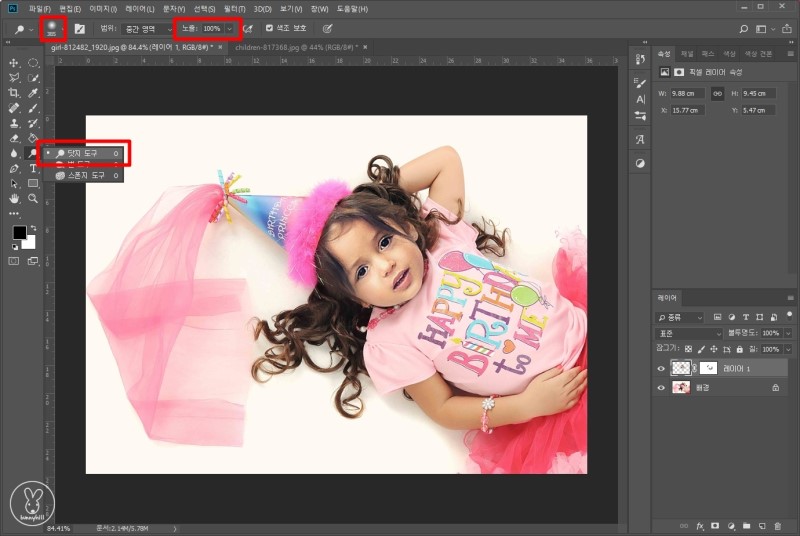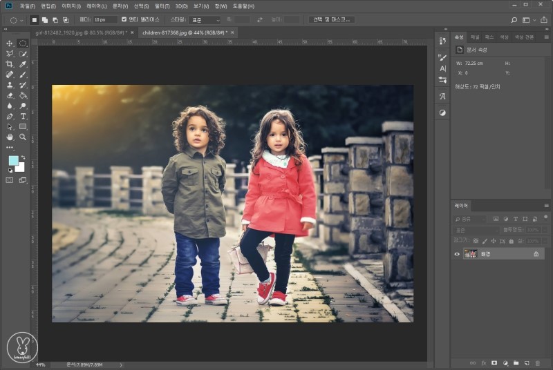 배경은 환한데 얼굴이 조금 어두운 것 같죠? 부분적으로 밝게 하거나 어둡게 하고 싶을 때는 닷지 도구와 번 도구를 이용합니다. 밝게 하고 싶다면 닷지 도구! 어둡게 하고 싶다면 번 도구를 활용해보세요.