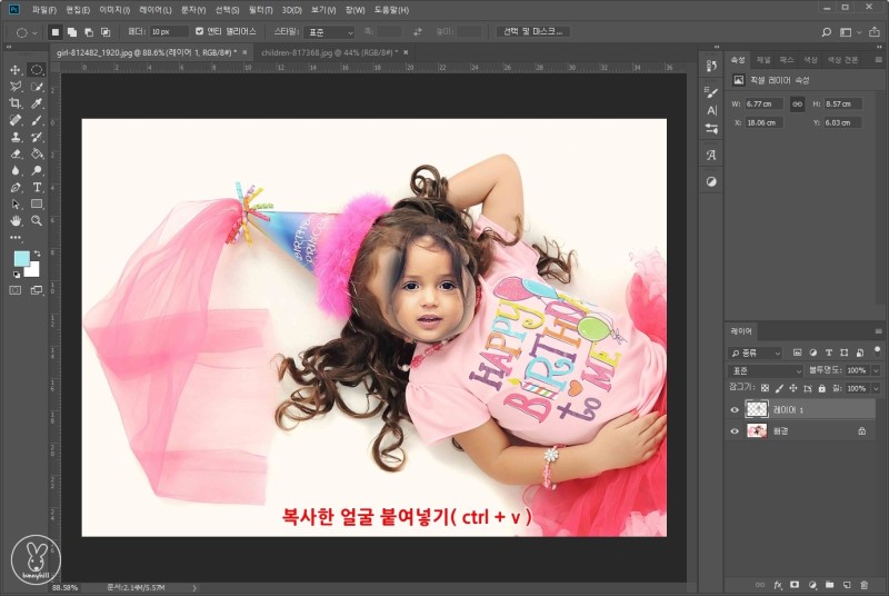 그다음 2번 사진으로 넘어가 붙여넣기( ctrl + v)를 해줍니다. 그리고 이동 도구 ( 툴바 첫 번째  + 모양)를 이용해 얼굴 주변으로 옮겨주세요.