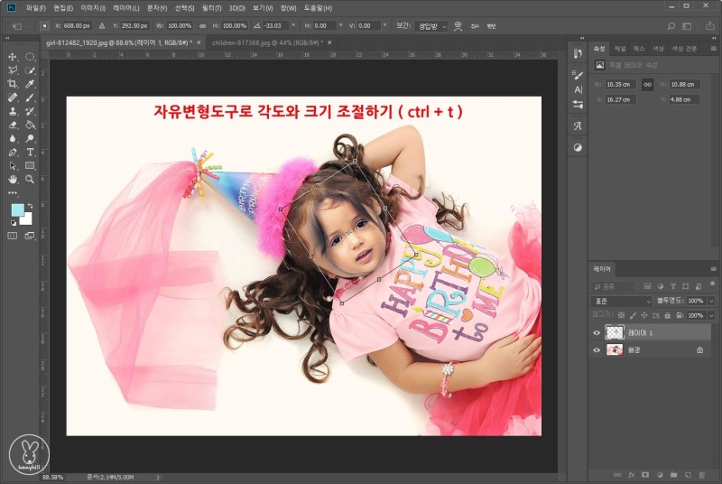 이제 얼굴의 크기와 각도를 조절합니다. 자유 변형 도구를 이용하면 편한데요~ 단축키 ctrl + t를 눌러 실행해줍니다. 그러면 위 사진처럼 8개의 포인트가 생기는데요. 각 포인트에서 마우스를 이용해 크기를 조절해줍니다. 비율을 그대로 유지하려면 Shift를 누른 상태에서 조절해주세요. 각 꼭짓점에서 마우스가 곡선으로 바뀌면 각도 조절도 가능해요!