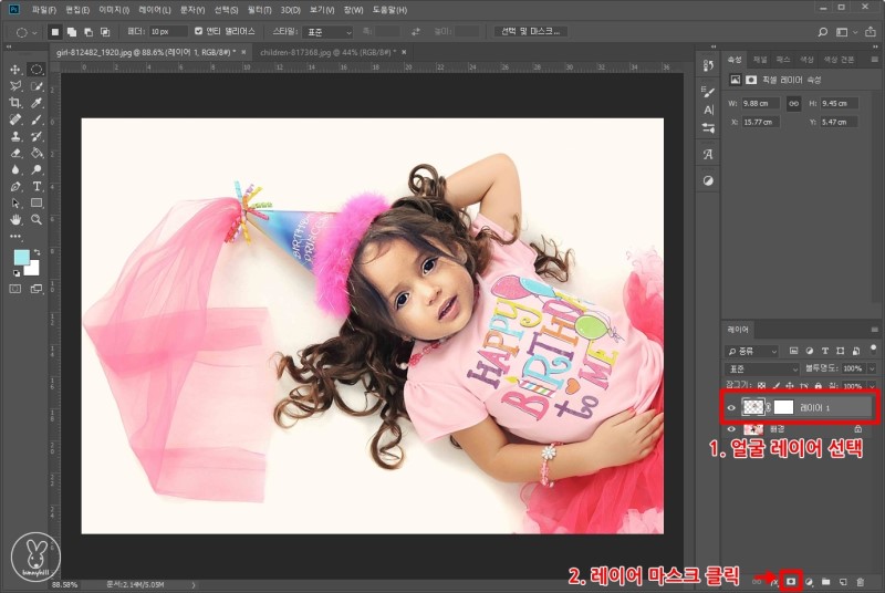 이렇게 얼굴에 잘 맞춰줬어요~! 하지만 어색한 부분이 꼭 생기더라구요. 그럴 경우에는 레이어 마스크를 활용해 지워주면 됩니다. 얼굴이 들어있는 레이어를 선택한 후 레이어 아래 3번째에 있는 레이어 마스크 아이콘을 클릭합니다.