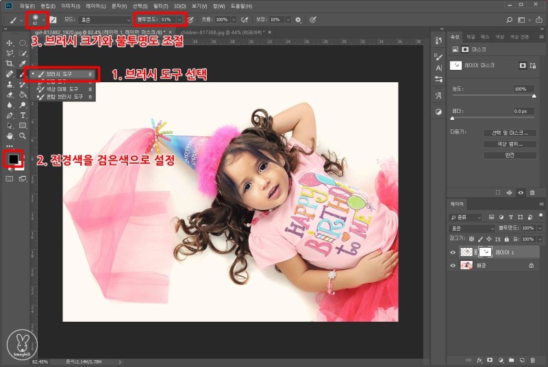 그리고 브러시 도구를 선택해 어색한 부분을 문질러주세요. 이때 전경색은 반드시 검은색이어야 해요! 레이어 마스크에서 검은색은 지우기, 흰색은 칠하기라고 생각하시면 편해요. 지운 부분을 다시 살리고 싶다면 전경색을 흰색으로 바꾼 뒤 문질러주면 됩니다. 저는 얼굴 테두리 부분과 머리카락을 정리해줬어요.