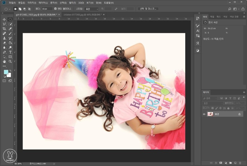 먼저 사진을 불러옵니다. 저는 2개의 아이 사진을 가져왔는데요~ 위의 사진을 1번, 아래 사진을 2번이라고 부를게요. 1번 사진 속 아이의 얼굴을 2번 사진에 합성하려고 해요!