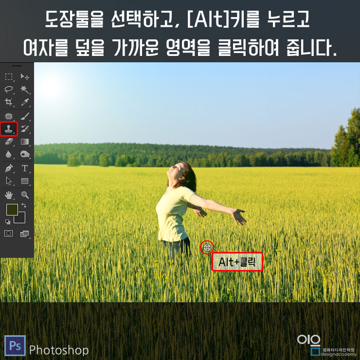 ▲도장툴을 선택한 후, [Alt]키를 누르고 제거할 여자의 가까운 영역을 클릭하여줍니다.