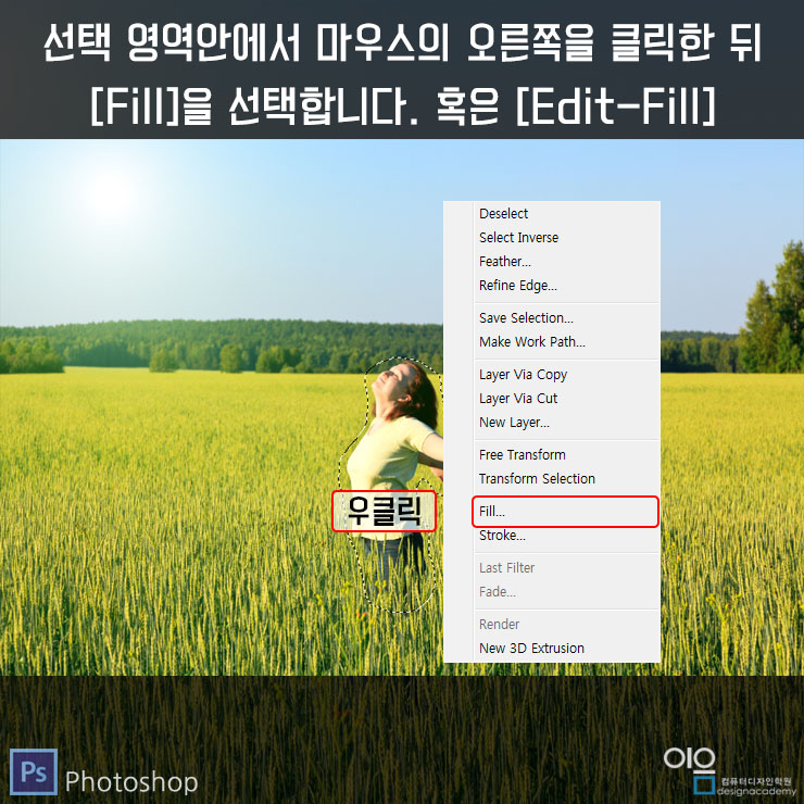 ▲선택영역 안에서 마우스의 오른쪽을 클릭한 뒤 [Fill]을 선택합니다.