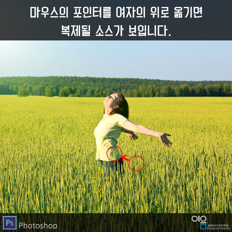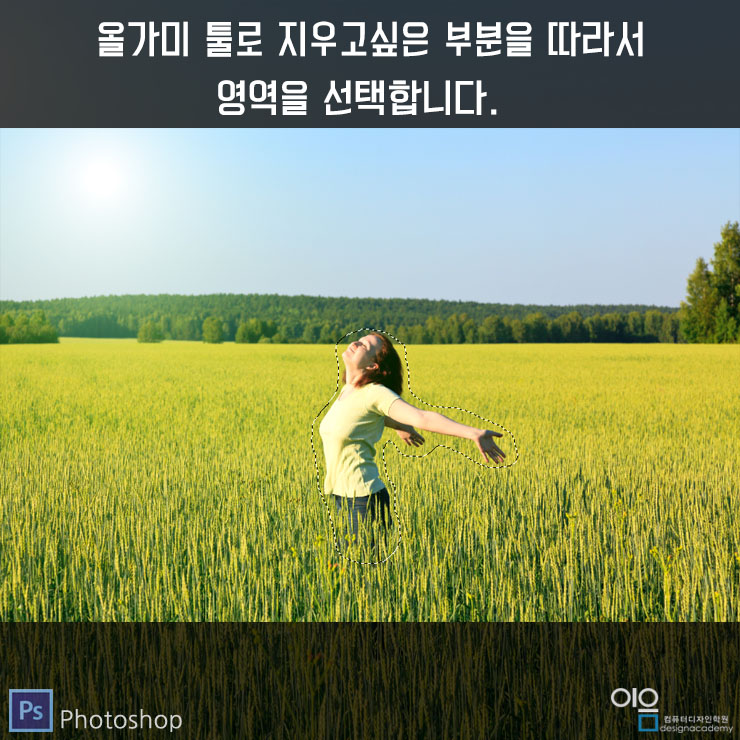 ▲선택영역안으로 여자의 모습이 제거되고 배경이 채워진 것을 볼 수 있습니다.