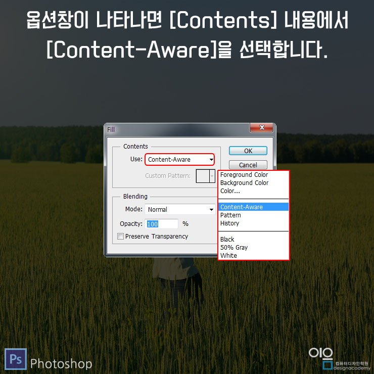 ▲옵션창이 나타난다면, [Contents]의 Use에서 [Content-Aware]를 선택하여 줍니다.