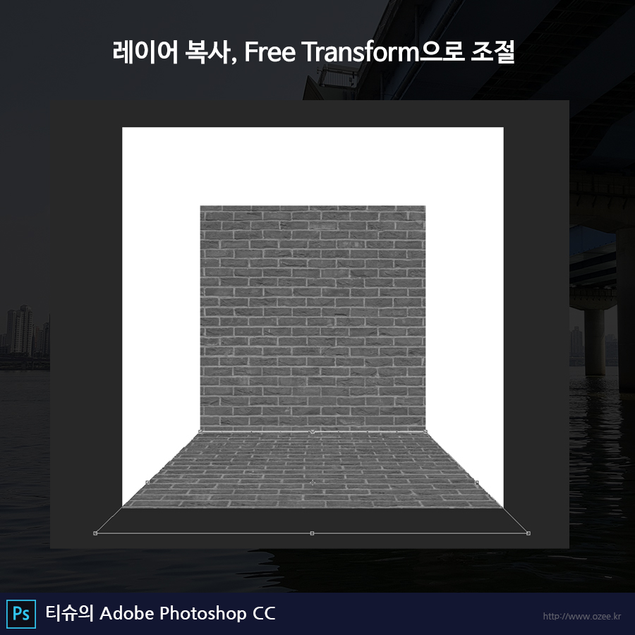이때 Free Transform을 이용하여 투시에 맞게 잘 조절하여 입체적인 공간이 되도록 해줍니다.