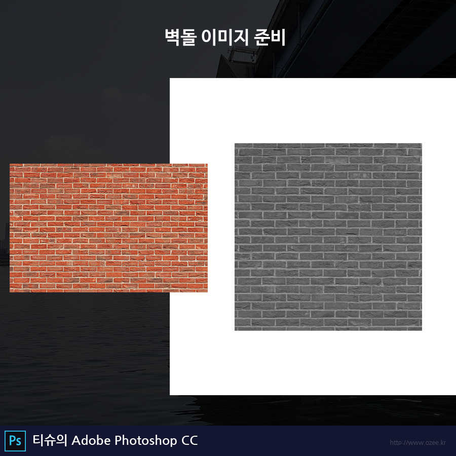 먼저 좌측 이미지와 같은 벽돌 원본 이미지를 준비합니다. 그런 다음 우측처럼 흑백으로 표현을 해줄 텐데요.