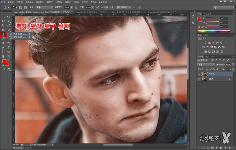 위와 마찬가지로 레이어 복사 후 복제 도장 도구를 선택합니다