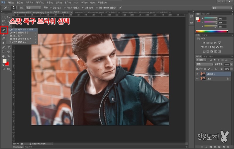 툴 바에 4번째에 있는 반창고 모양의 스팟 복구 브러쉬를 선택합니다