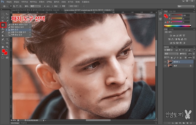 1번의 방법과 마찬가지로 레이어 복사 를 한 후 패치 도구를 선택해줍니다