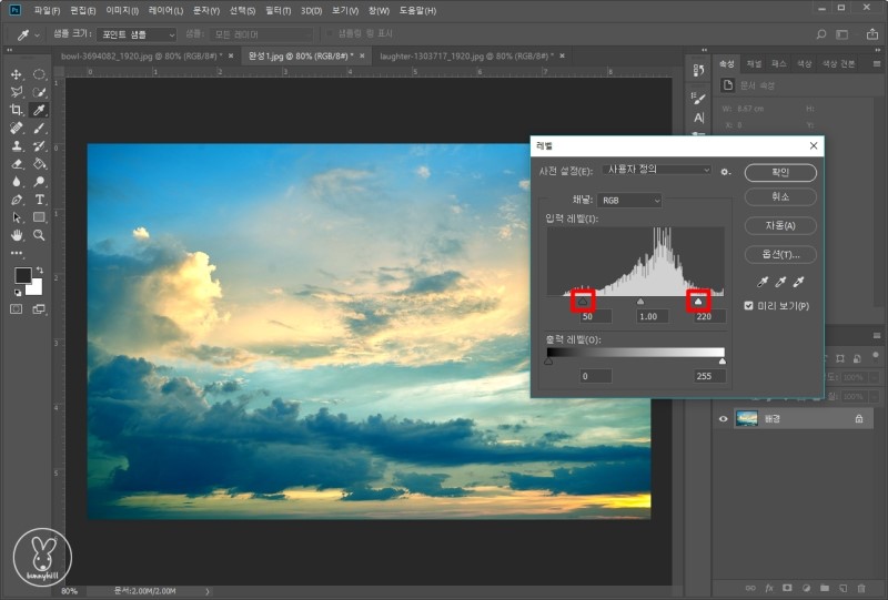 여기까지 하면 정말 간단하게 보정이 끝나는데요. 밝기를 조금 조절해보려구요. 이미지 - 조정 - 레벨을 선택해줍니다. 단축키는 Ctrl + L입니다.