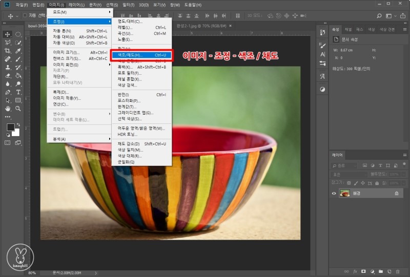 이미지 - 조정 - 채도 / 색조를 선택합니다.