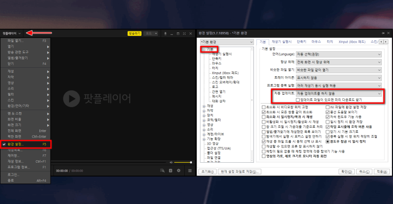 좌측 상단의 팟플레이어를 클릭하면 전체 메뉴가 열립니다. 아래의 환경 설정으로 들어가면 우측 화면이 나옵니다.