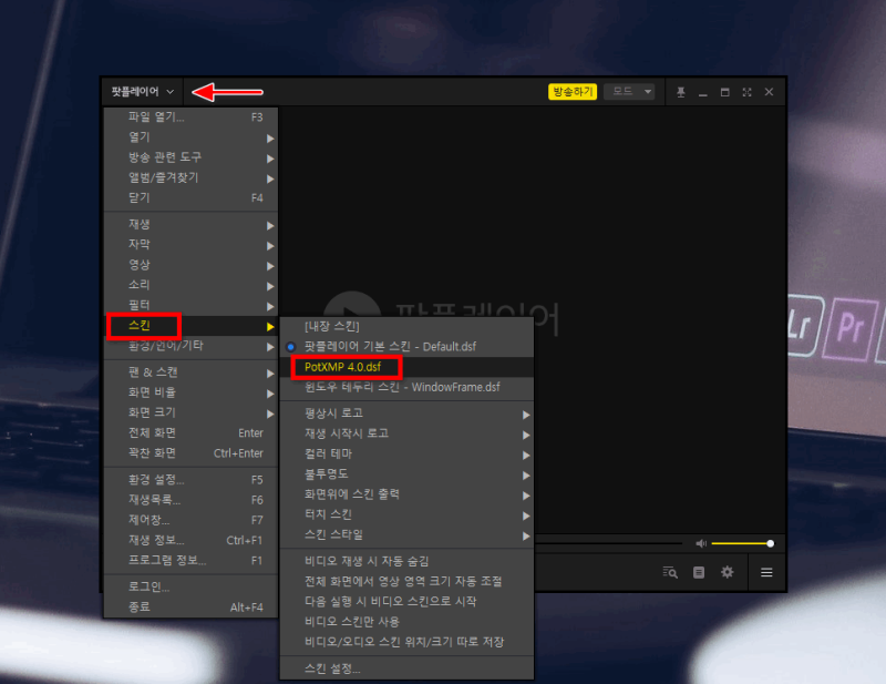 이후 팟플레이어의 전체 메뉴를 열고, 스킨을 누르면 열리는 패널에서 적용시킬 수 있습니다.