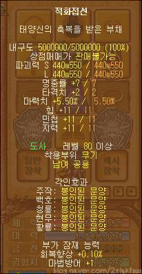 전설무기중에 가장 무난한 게 대모홍접선이에요. 다른 전설무기에 비해서 비교적 가격이 저렴하고 마뻥7%와 마법치명타가 숨옵으로 있어요.