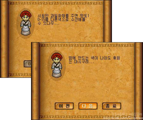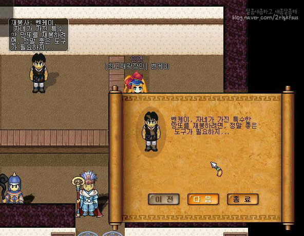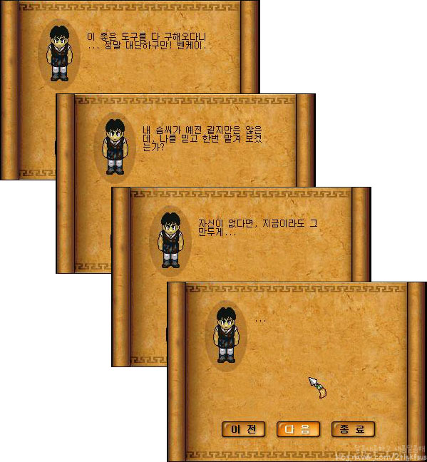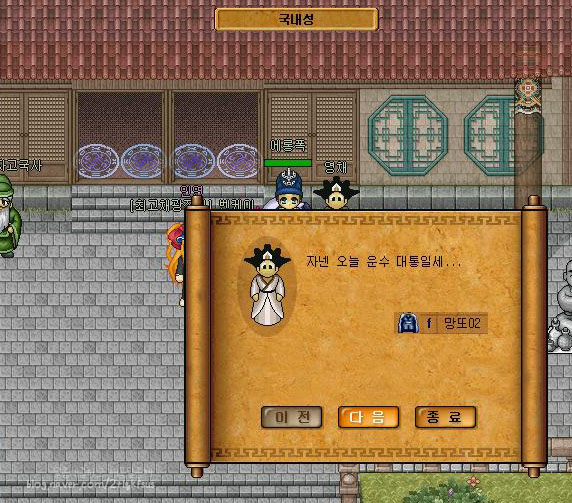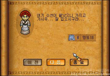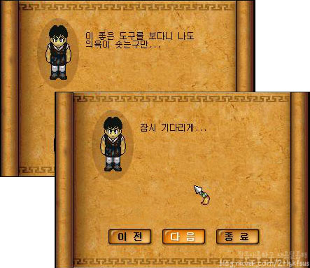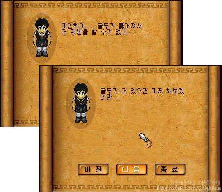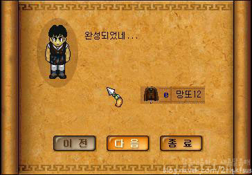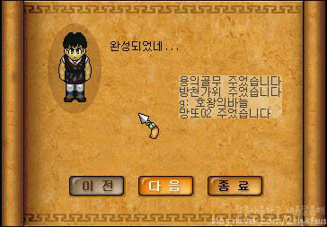 *용의골무-원숭이왕굴에서 나오는 한왕과 초왕을 가지고 부여놀이방 장기방의 두명의npc 중 한명을 클릭하여 장기를 이기면 50%확률로 황매주를 줍니다.