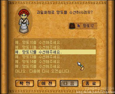 용의골무- 원숭이왕굴에서 나오는 한왕과 초왕을 가지고 부여놀이방 장기방의 두명의npc 중 한명을 클릭하여 장기를 이기면 50%확률로 황매주를 줍니다. 이 황매주를 고구려놀이방 장기방의 노인npc에게 가져다주면 용의골무로 바꿔줍니다.