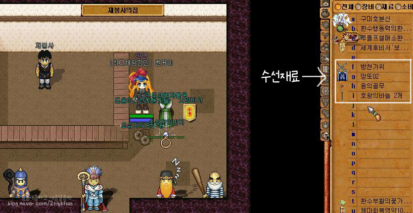 템창에 보이는 수선재료(방천가위, 번호망또&웨딩, 용의골무, 호왕의바늘)를 들고 재봉사를 눌러주세요.