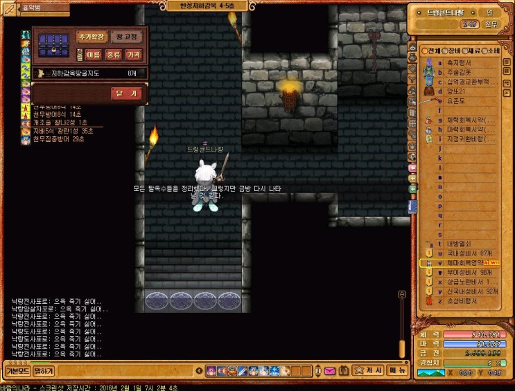 6.지하감옥(위 4개보다 어려움, 보무의목걸이 끼고, 템체력이 한 5만정도는 되야 그나마 할만함, 경험치좋음)