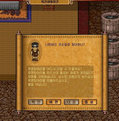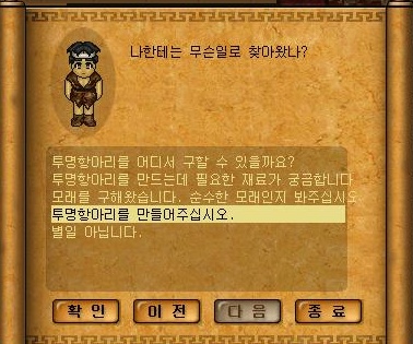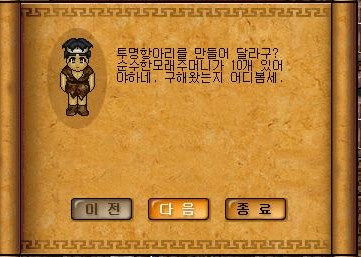 투명항아리를 만들려면 순수한모래주머니10개 필요해요