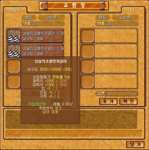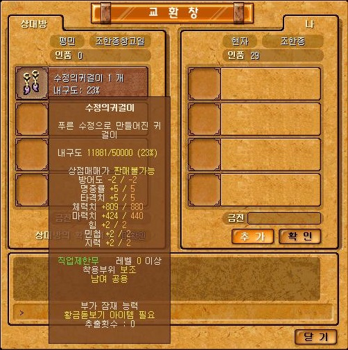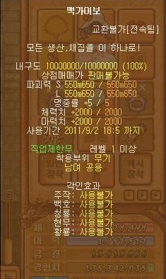 - 수정의귀걸이보다 체마/힘민지 상승량이 높은 보조장비로 이벤트때 한정적으로 뿌렸기 때문에 다른 사람들에게서 사야합니다.