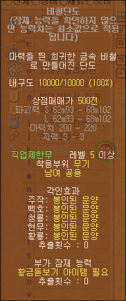 - 도삭산 500층 퀘스트를 통해 얻을수 있는 보조장비로 많은 능력치를 골고루 올려주기 때문에 성능이 아주 좋습니다.