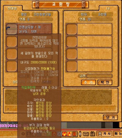 수련검보다 매우 강력한 파괴력과 함께 소량의 마력치, 지력을 올려주어 주술사 및 도사에게도 매우 좋습니다.