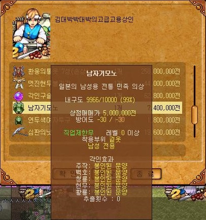 - 일본에서 파는 1000만전짜리 뽀대용(과거기준) 아이템이지만 저렙 장비 중에서 방어도가 제일 높은 장비이기도 합니다.