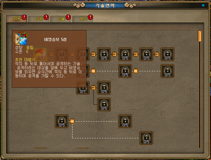 투명을 1, 비영승보를 2에 두고 121212를 반복하는 사냥으로 공격속도가 일반 평타의 2~3배는 빠르므로 매우 신속한 사냥이 가능합니다.
