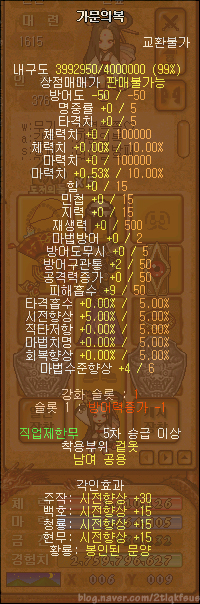 가문의복을 제일 추천해요. 구양 사냥하려면 방어력이 높아야 좋은데 가문의복 방어작 다 하시면 기본 -50이구요. 여기서 강화해서 -1~-2까지 더 추가 가능해요.