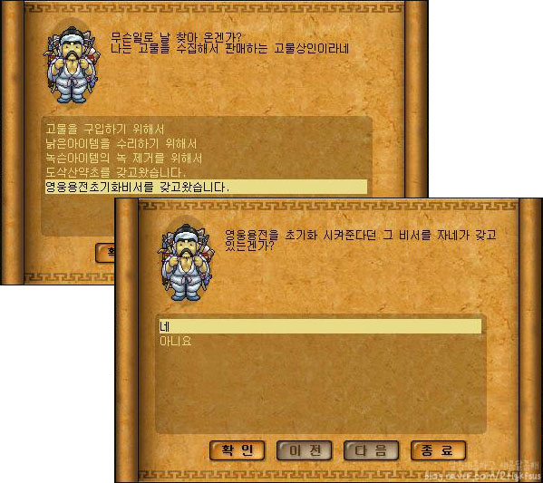 영웅용전비서를 가지고 고물상을 다시 찾아주시구요.
